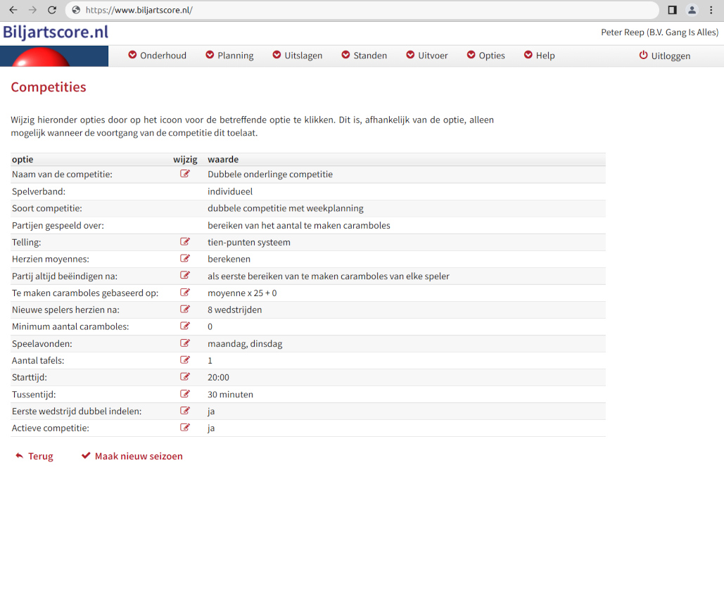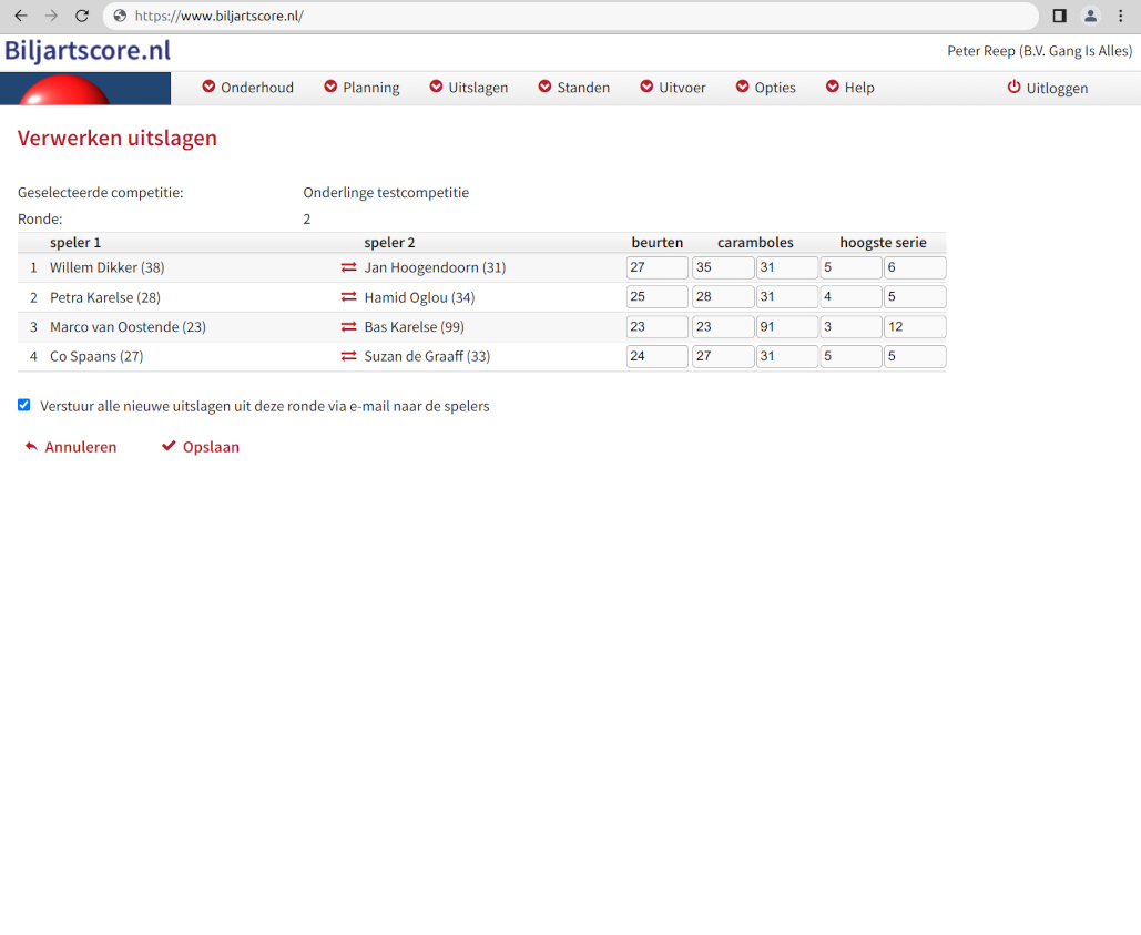 Biljartscore biedt alles voor het organiseren en verwerken van planningen, uitslagen en standen voor de biljartsport. biljart biljarten software uitslag biljartsoftware uitslagen stand uitslagenverwerking competitieleider standen score competitie wedstrijdleider verwerking